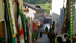 Am Sonntagmorgen trafen sich die rund 25 Schützenabordnungen aus den verschiedenen Teilen Tirols, die Ehrenkompanien aus Wörgl und Sillian, sowie die Musikkapellen Sexten und Wörgl beim „Haus Sexten“, wo Landeshauptmann Günther Platter die Frontabschreitung durchführte.