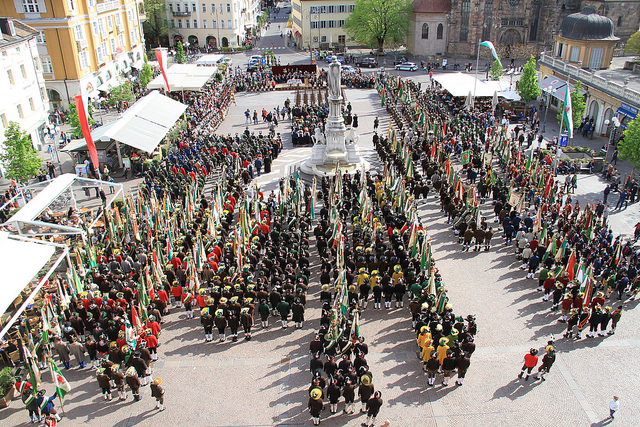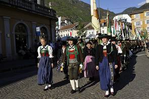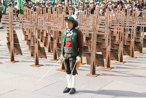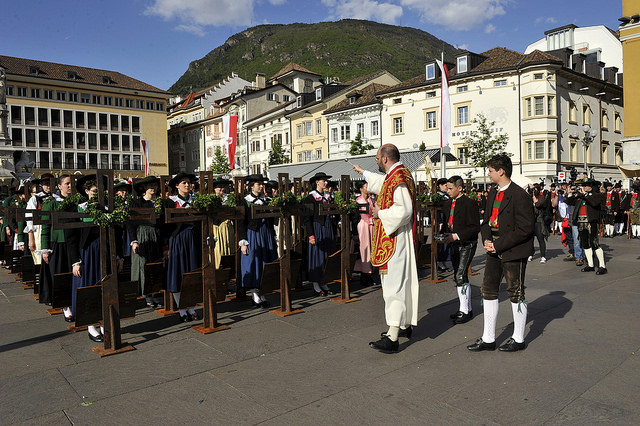 BOZEN - An der Front 1915-2015 – Gedenken an den Einsatz der Standschützen im Ersten Weltkrieg. Unter diesem Motto fand durch die Tiroler Schützen aus dem historischen Tirol eine Gedenkveranstaltung am Bozner Waltherplatz statt. Gesegnet wurden 70 Stahlkreuze, die entlang der ehemaligen Frontlinie aufgestellt werden, wo Tiroler Standschützen gewirkt haben und gefallen sind. Marketenderinnen aus ganz Tirol fungierten als Patinnen.