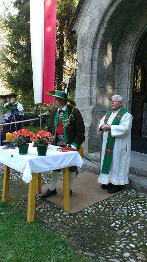 Pfarrer Franz Künig hielt einen schönen Wortgottesdienst inmitten des Föhrenwaldes bei der kürzlich renovierten Klosterwaldkapelle. Nachdem in den letzten Jahren der Innenputz in der Kapelle schon mehrmals notdürftig ausgebessert worden war, haben nun die Michelsburger Schützen mit der Fa. Rudolf Dantone eine grundlegende Sanierung vorgenommen.