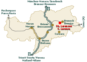 - Über den Brenner bis zur Autobahnausfahrt Brixen/Pustertal. Ab der Autobahnausfahrt fahren Sie ca. 27 km durch das Pustertal und erreichen St. Lorenzen, das sich 3 km Westwärts der Stadt Bruneck befindet, ungefähr in der Mitte des Pustertales.